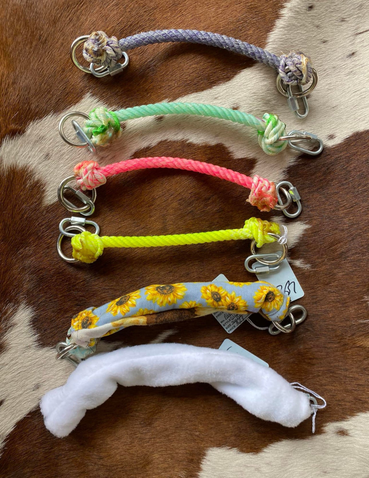 Attachable rope nose bands, these come standard at approximately 12” including the clips, this is standard size and seems to work for most of your average horse and bit combos, this will attach to the bit ( on the top ring where you headstall also attaches generally). The addition of this piece helps to add even pressure to the horses nose and helps encourage proper carriage of the bit.
