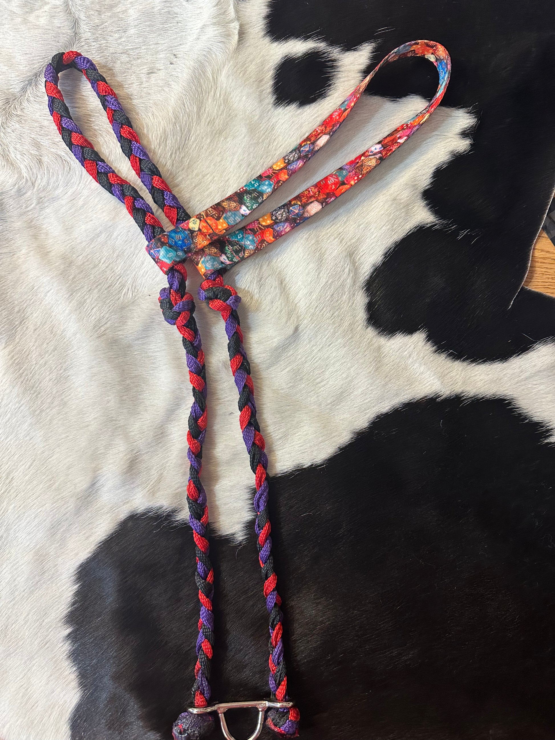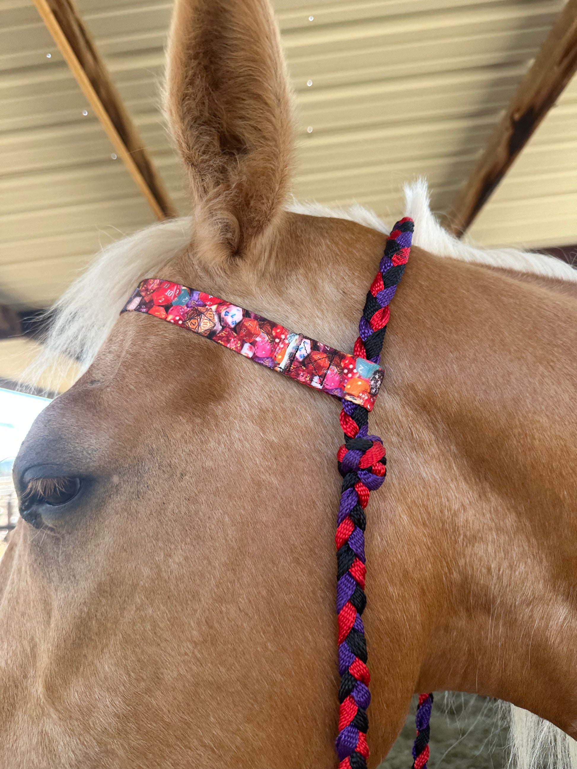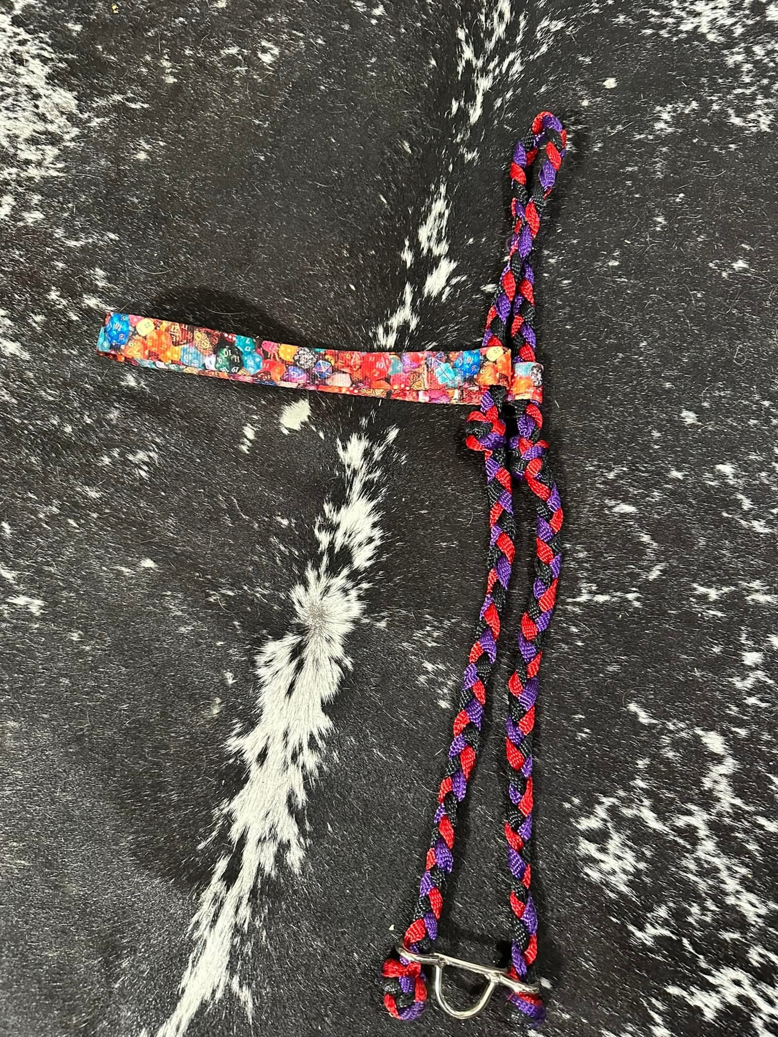 Black, red and purple braided mule tape with poker die printed webbed nylon. Nylon webbed section is attached allowing for it to be alternated with the solid mule tape section as to what is across forehead or behind ears for where you want the pressure.